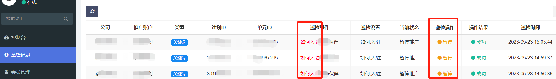 2、巡检操作:暂停,代表暂停了对应关键词/创意;